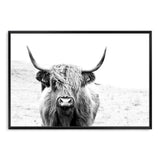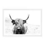 This highland cow print features Harvey the highland cow in black & white & is part of our Scottish highland cow print collection available as an unframed poster print, timber framed print or premium canvas print. Highland cow prints are a popular design trend of this beautiful long haired & long horned cattle breed.